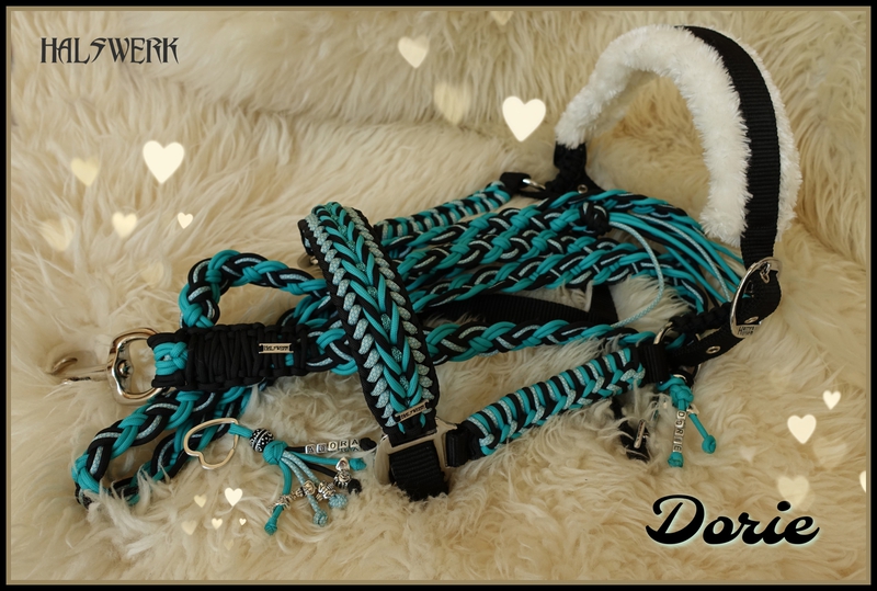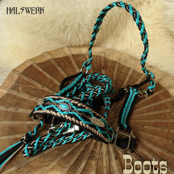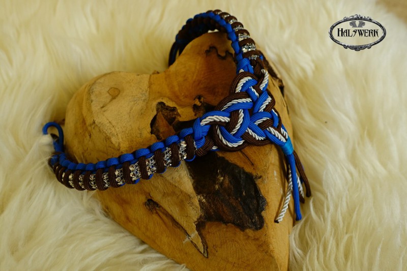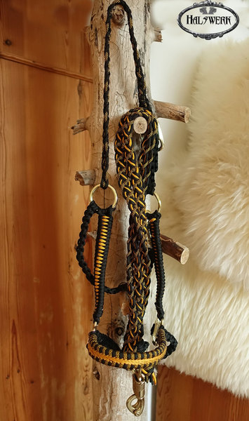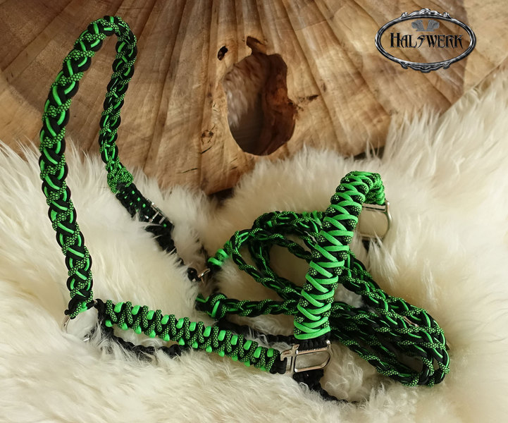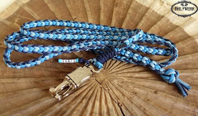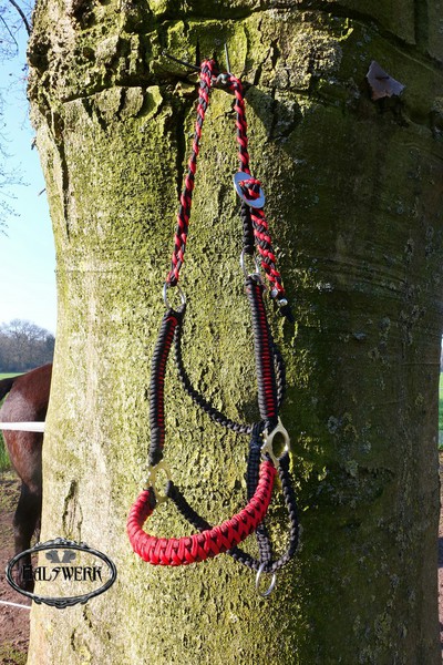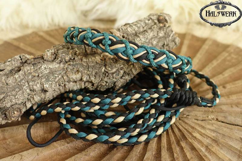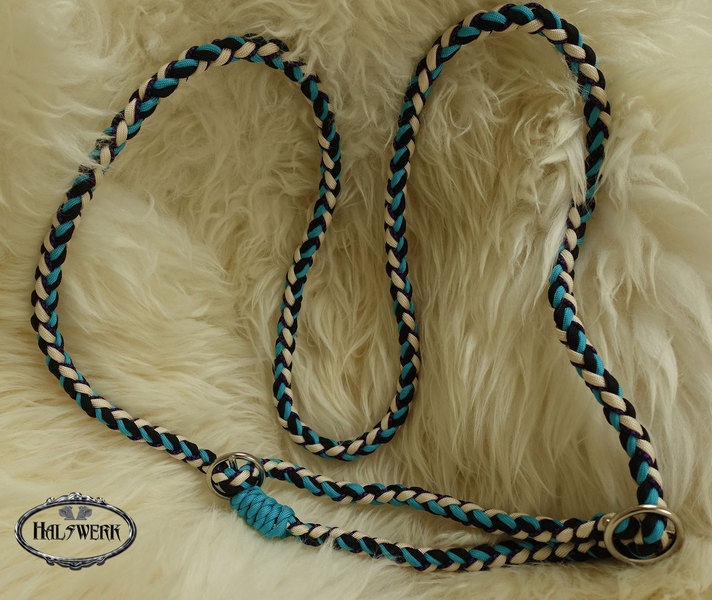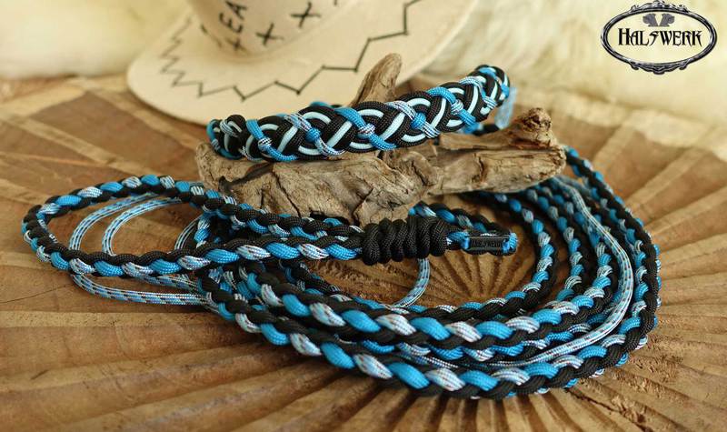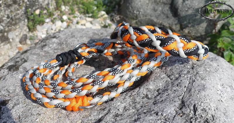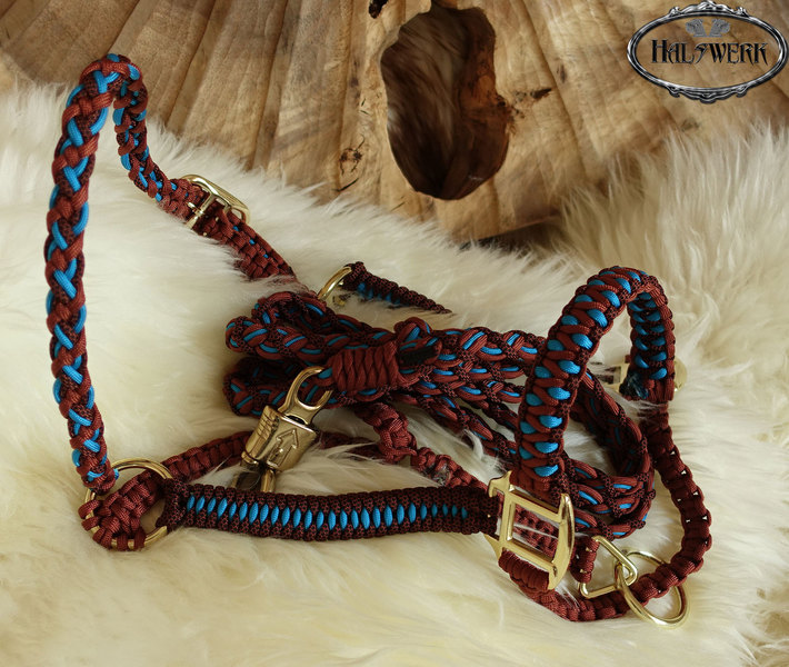 Bei der umflochtenen Variante wird ein Gurtbandhalfter mit Cord umflochten.