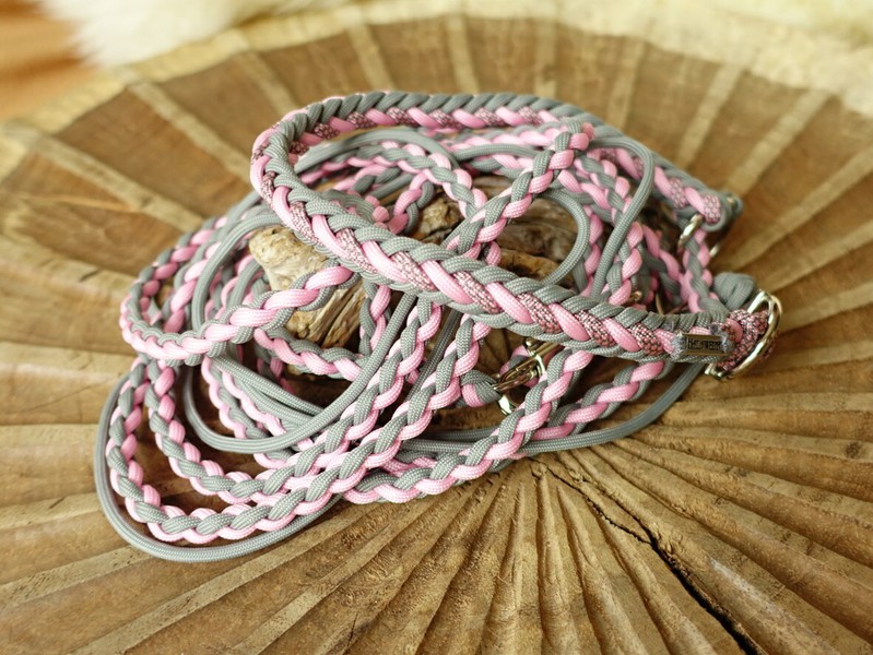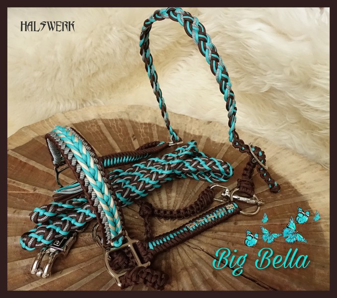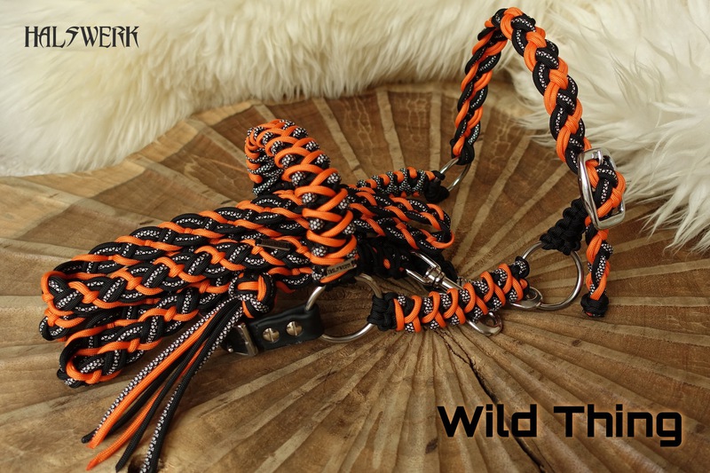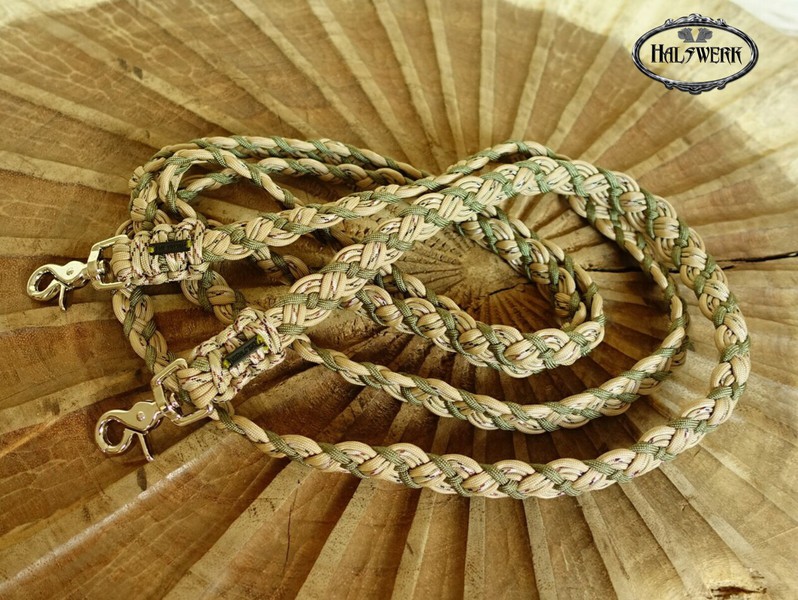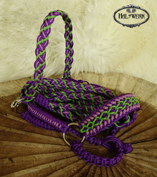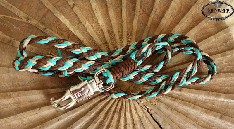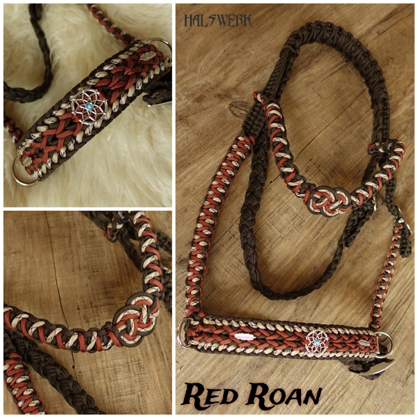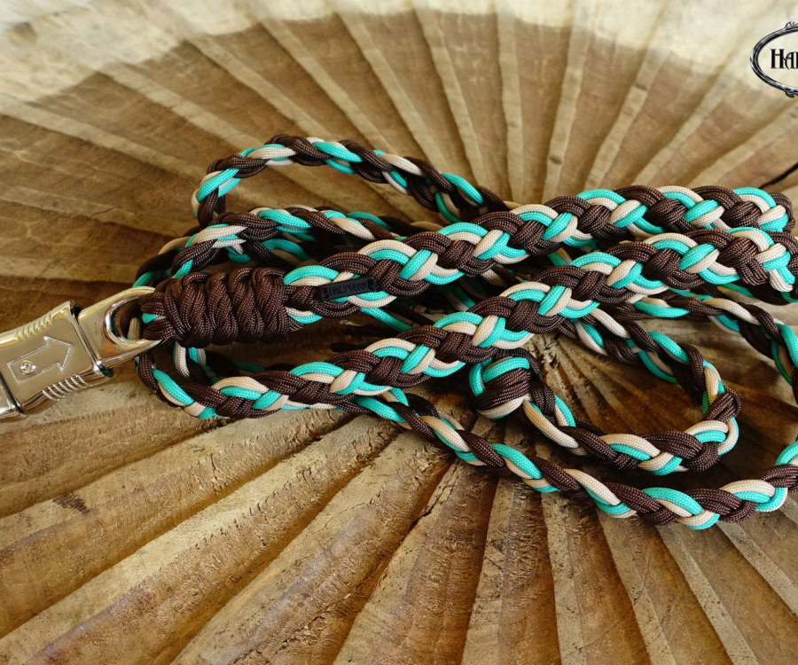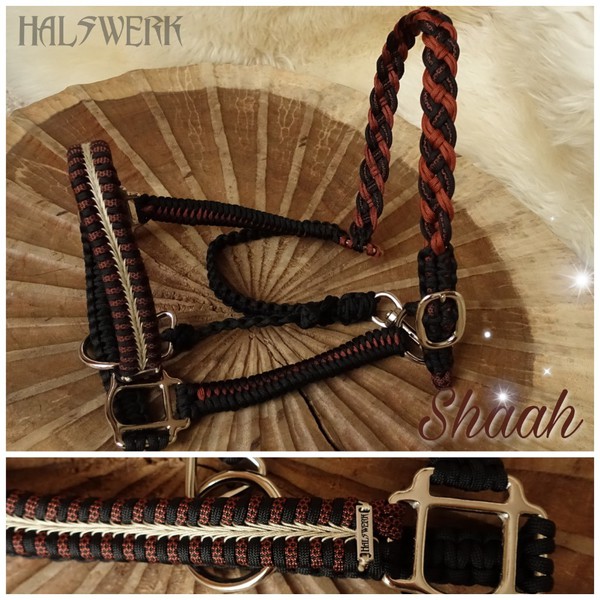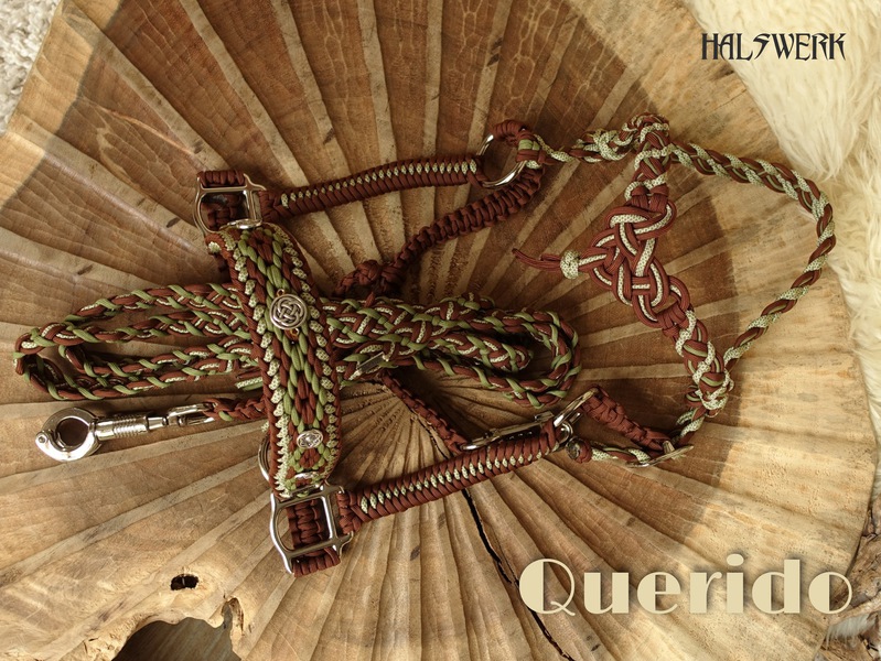 Bei der umflochtenen Variante wird ein Gurtbandhalfter mit Cord umflochten.