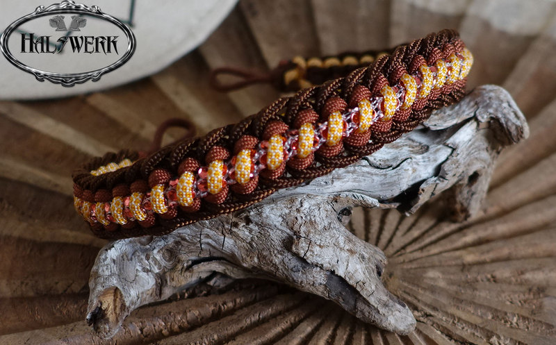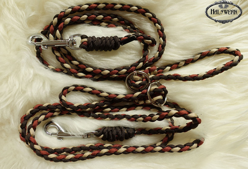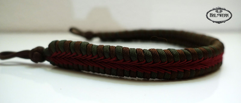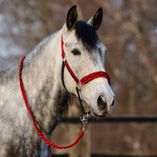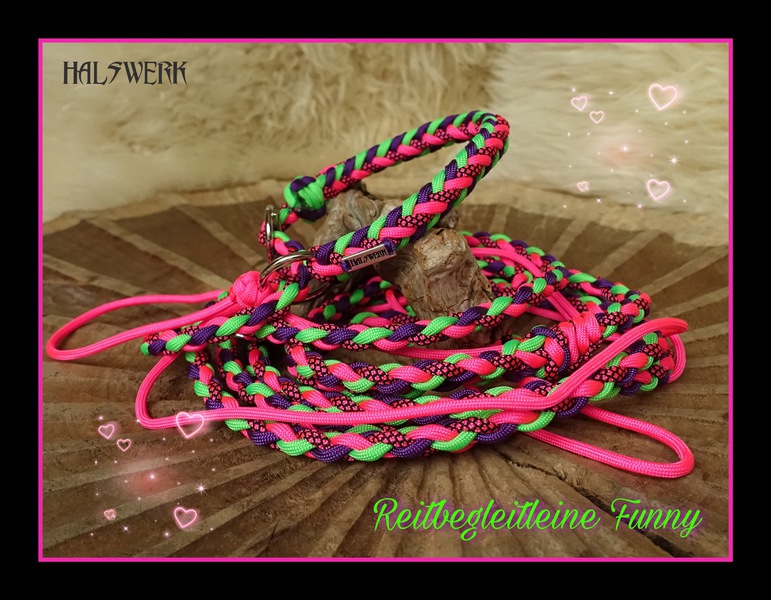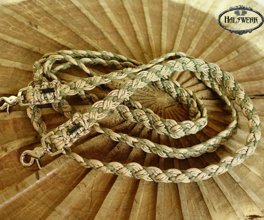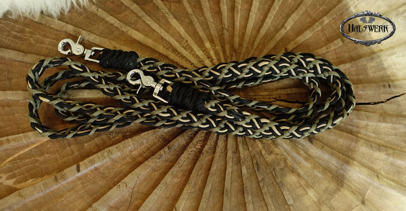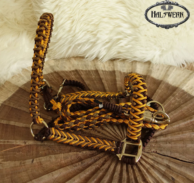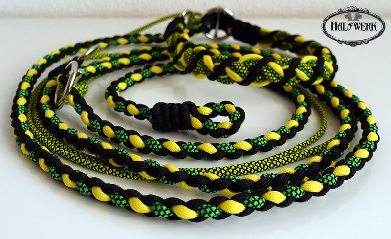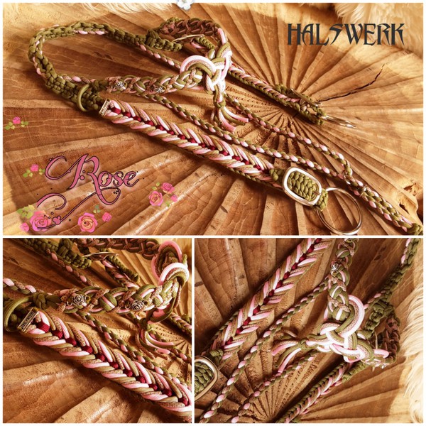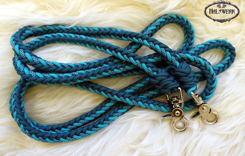 Bei der umflochtenen Variante wird ein Gurtbandhalfter mit Cord umflochten.
