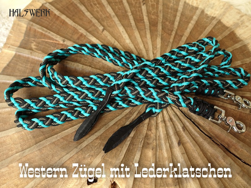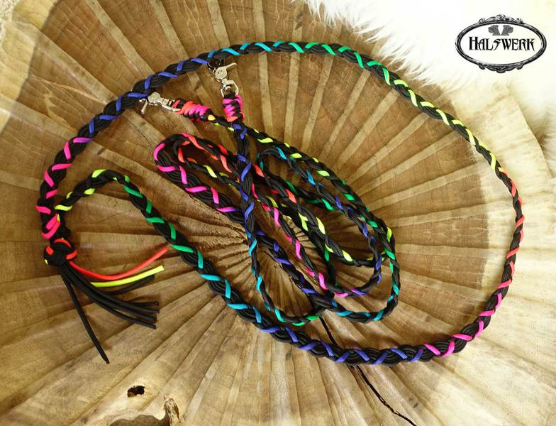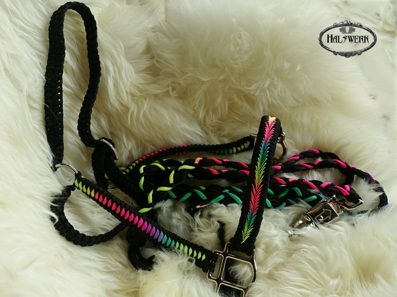 Umflochtene Halfter lassen sich in vielen Farbkombinationen gestalten. Es gibt eine eingeschränkte Musterauswahl die allerdings viele Gestaltungsmöglichkeiten bietet.