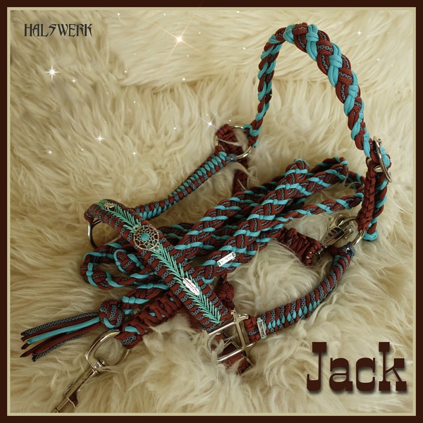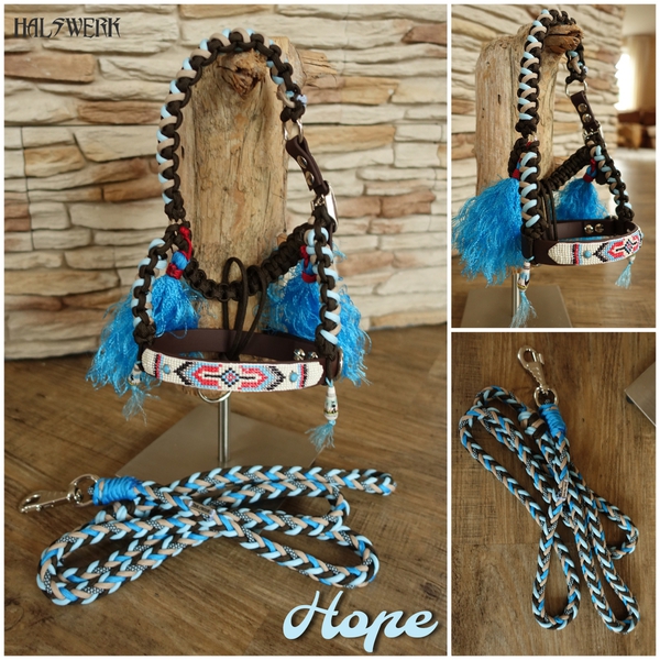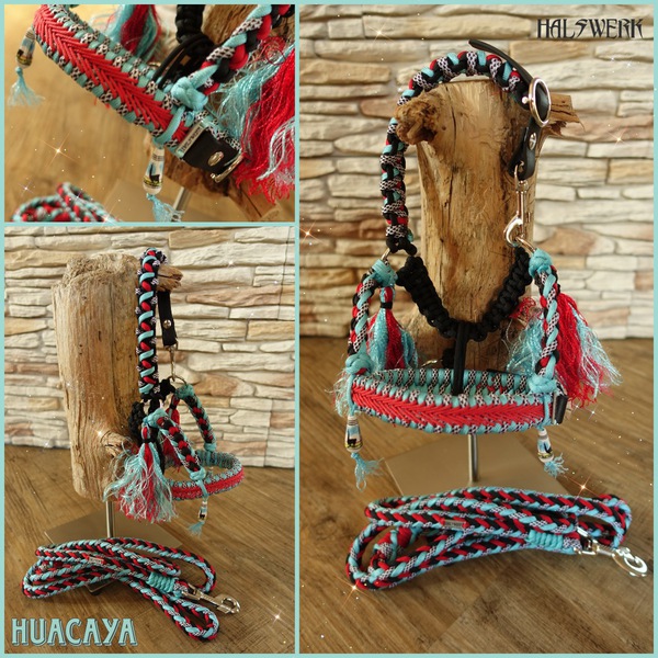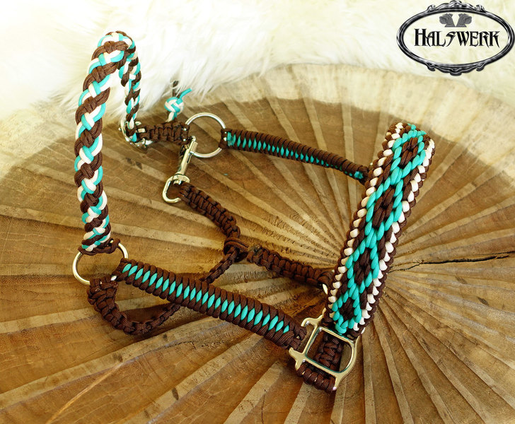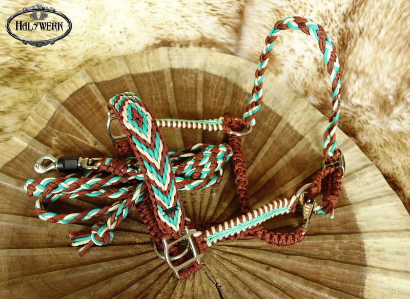 Unterschiedliche Muster harmonisch kombiniert. Der Nasenriemen wird mit aufwendigen V-Stick passend zur Halfterfarbe versehen.