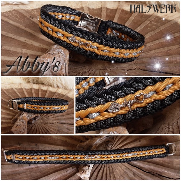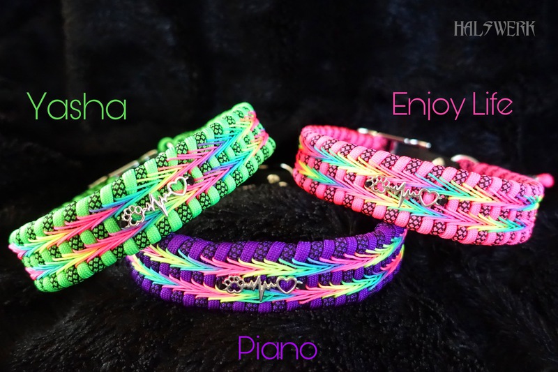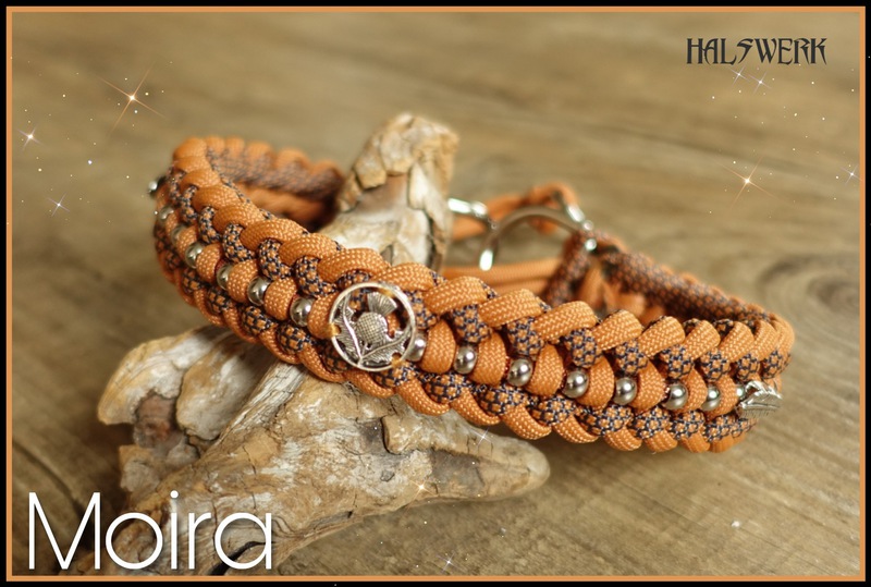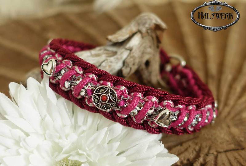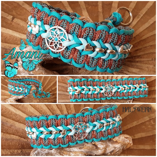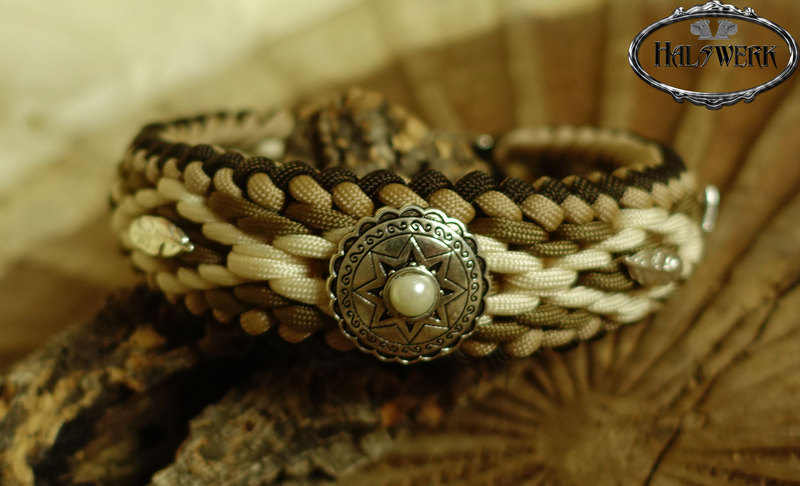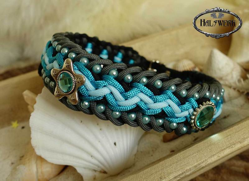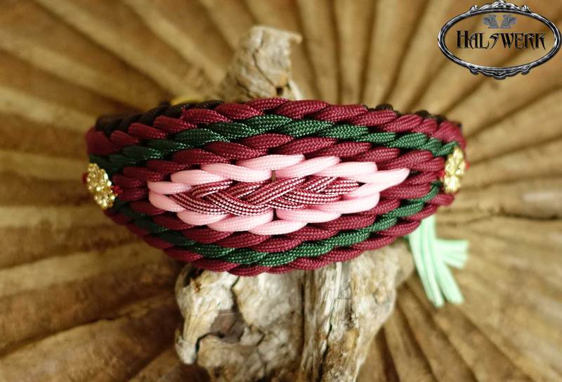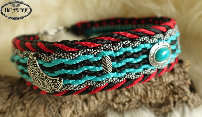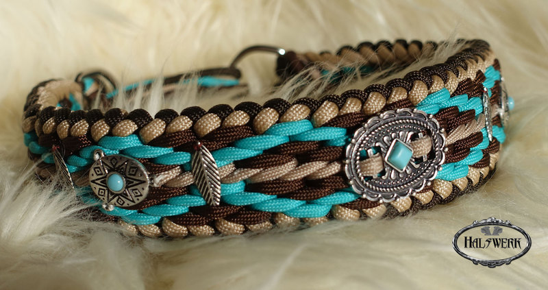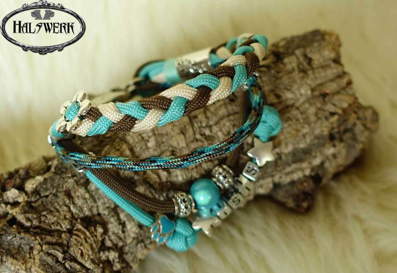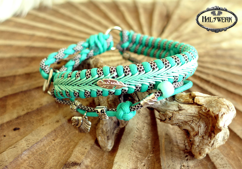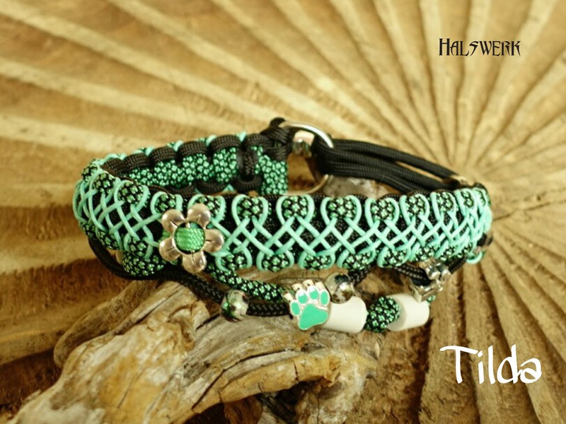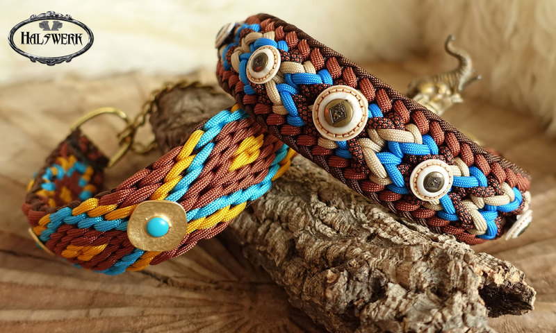Schmuckhalsband für leinenführige Hunde. Kombination aus Fallschirmseil und Borten mit diversen Charms.