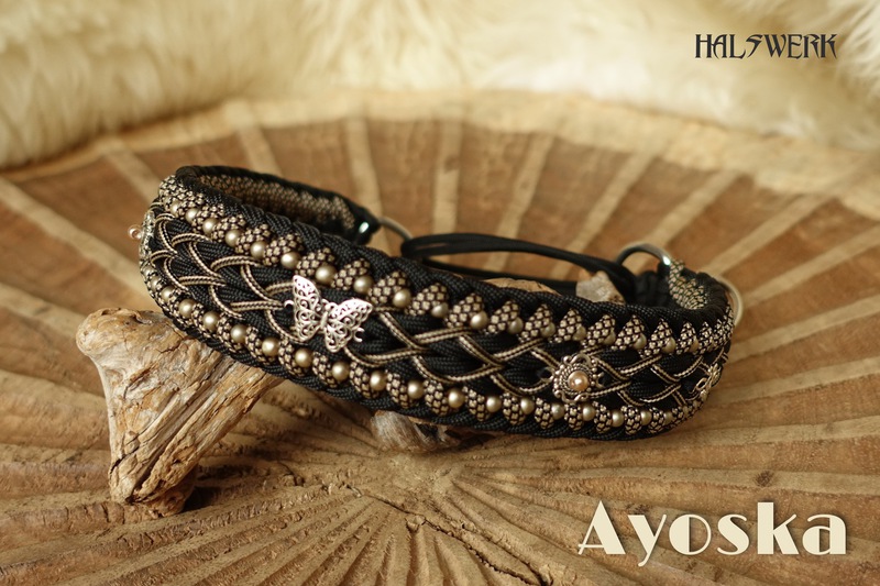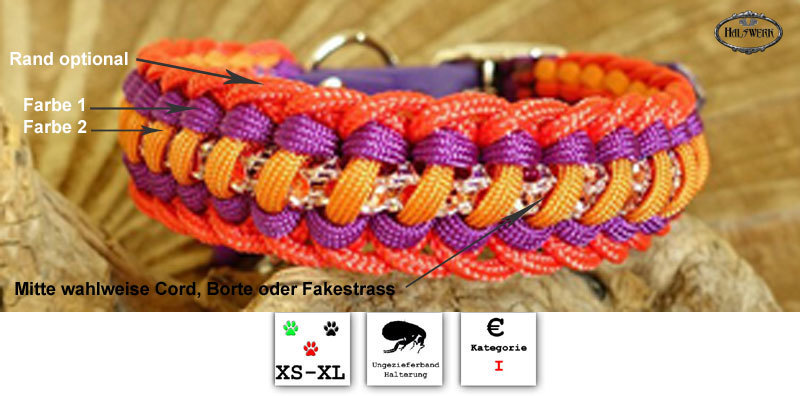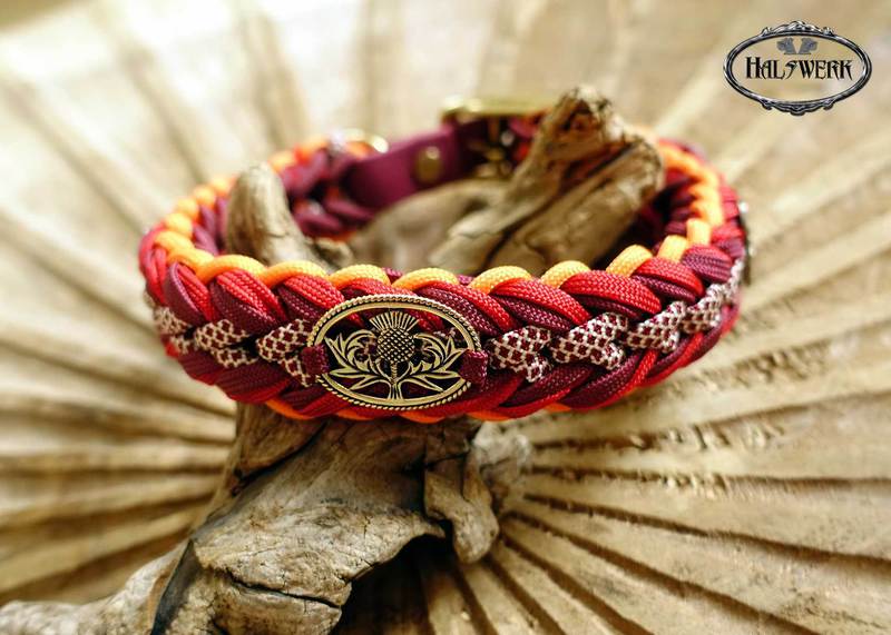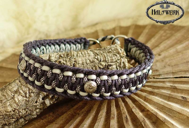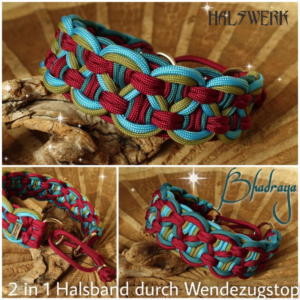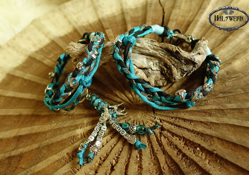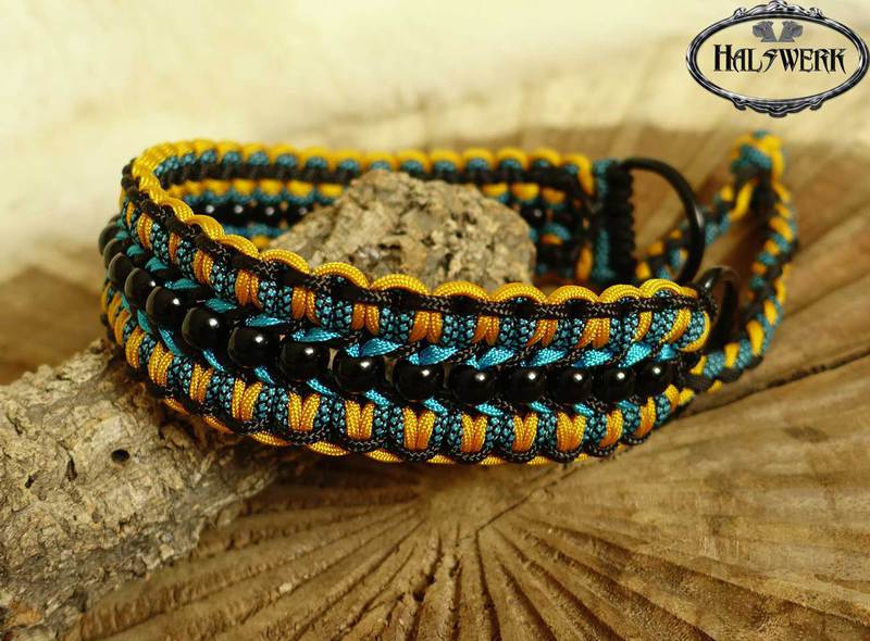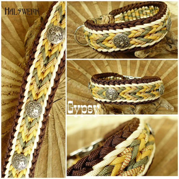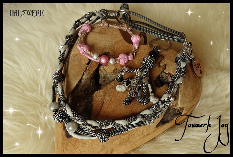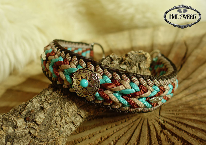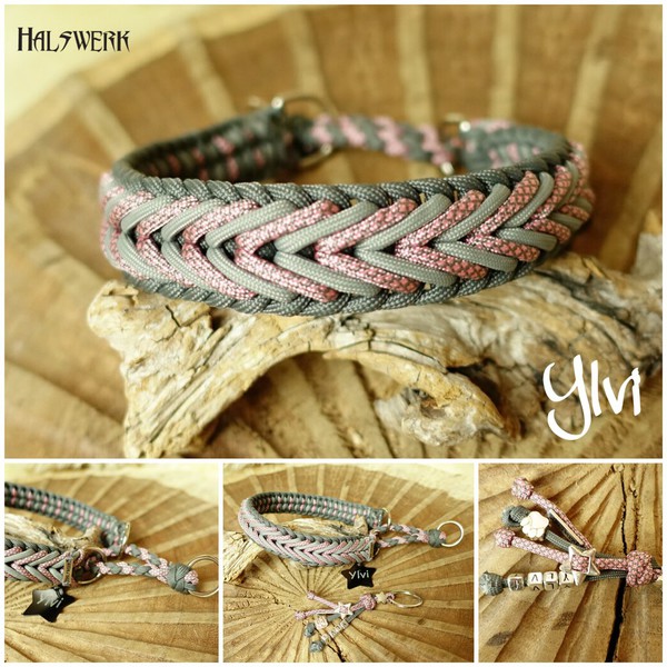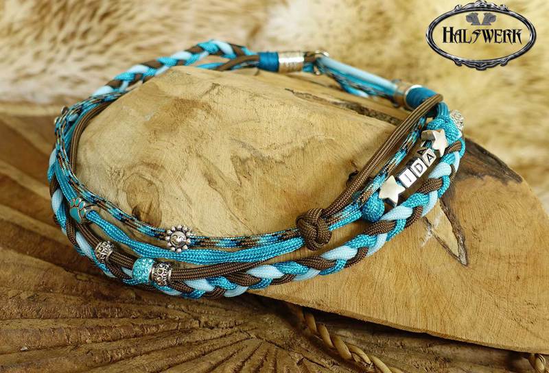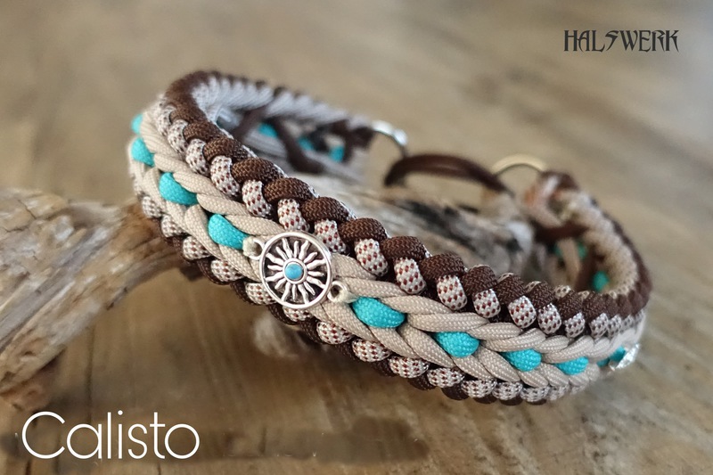 Schmuckhalsband für leinenführige Hunde. Kombination aus Fallschirmseil und Borten mit diversen Charms.