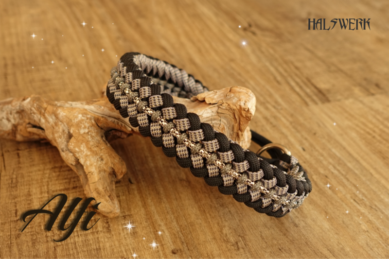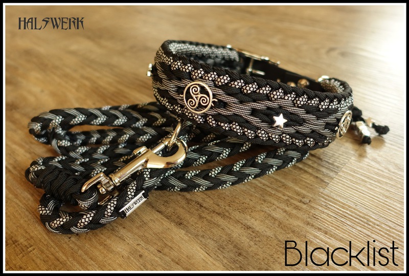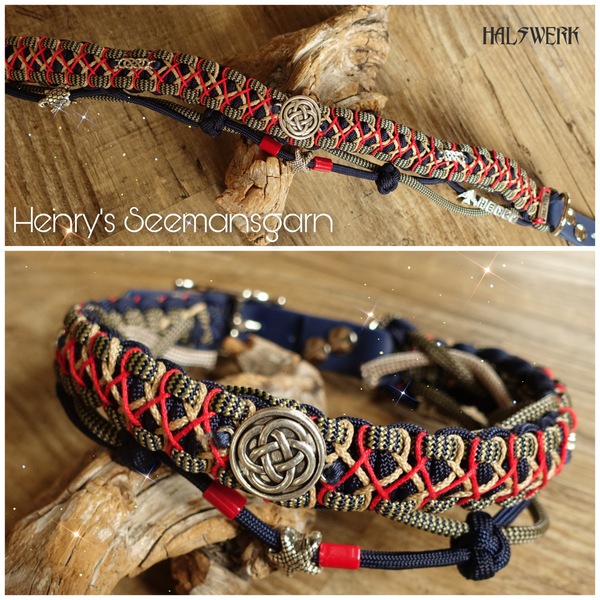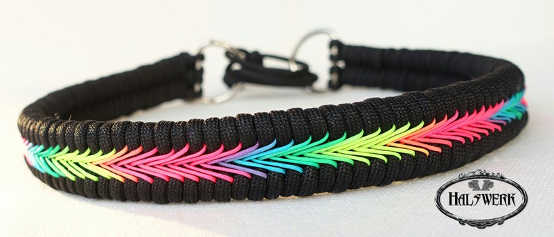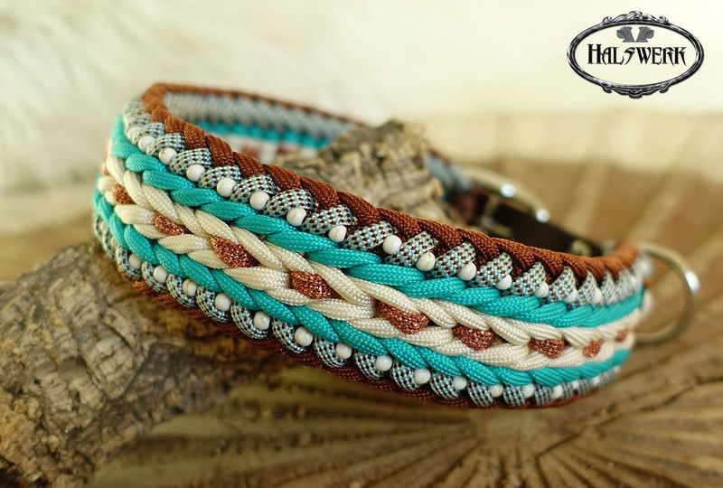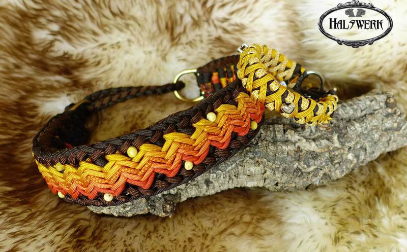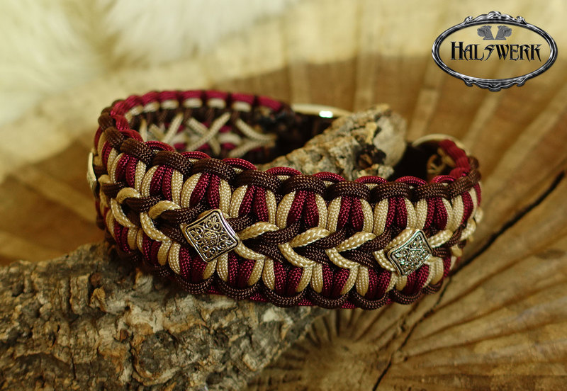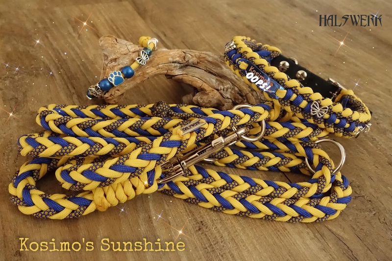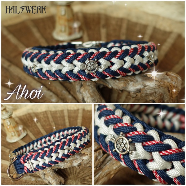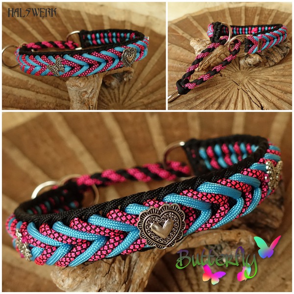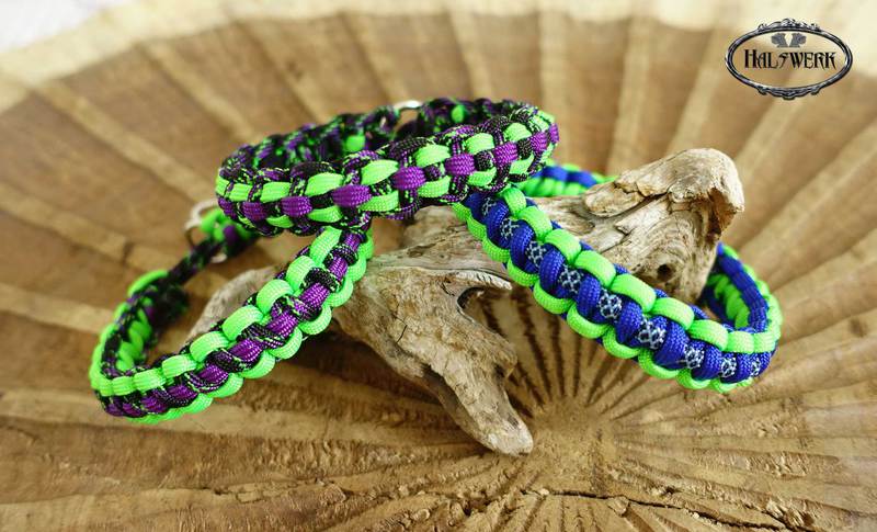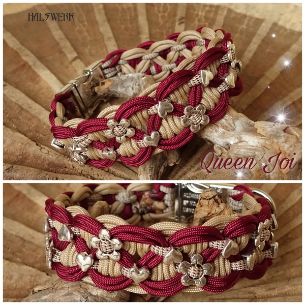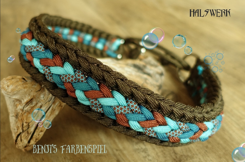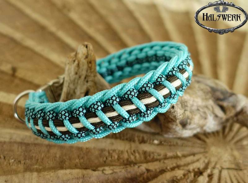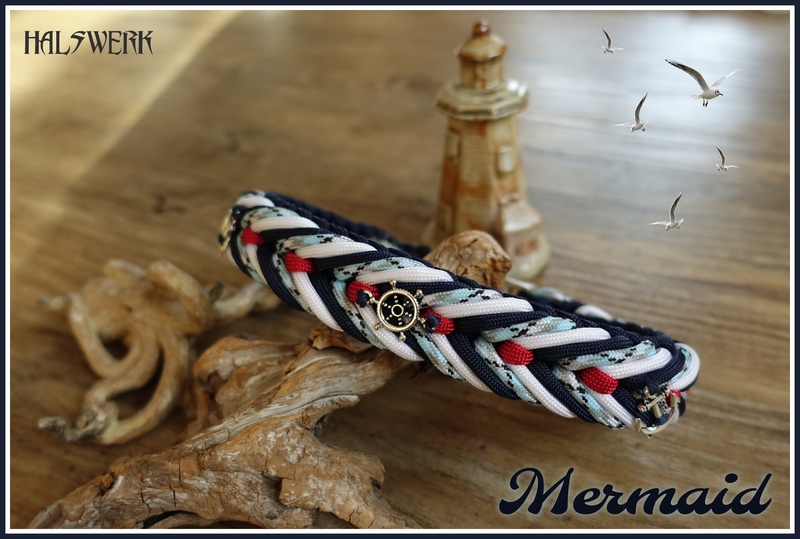 Schmuckhalsband für leinenführige Hunde. Kombination aus Fallschirmseil und Borten mit diversen Charms.