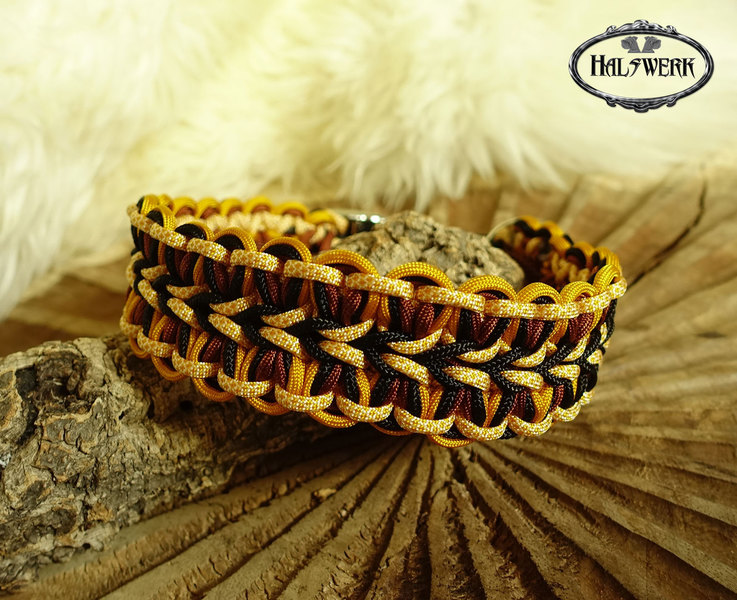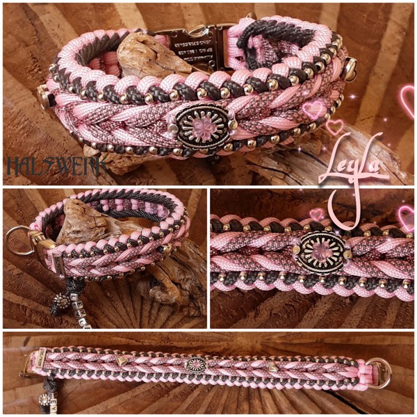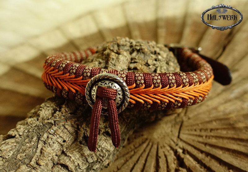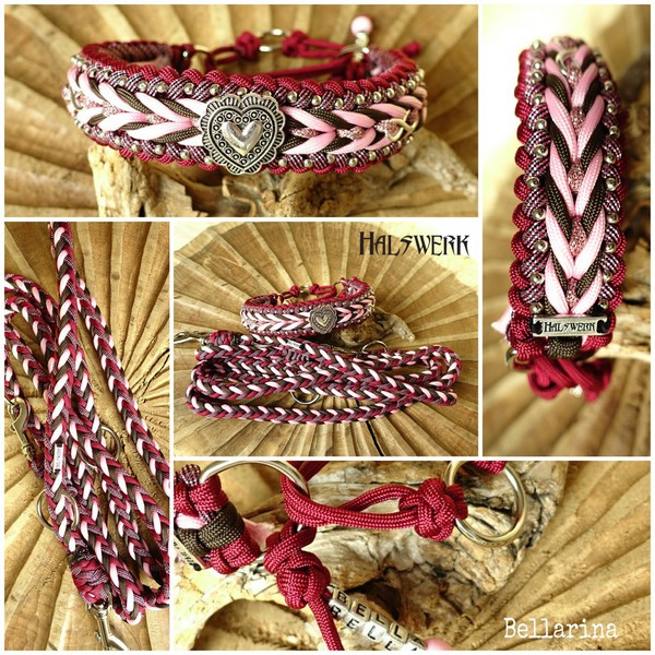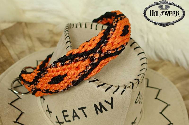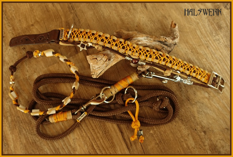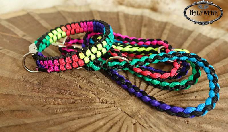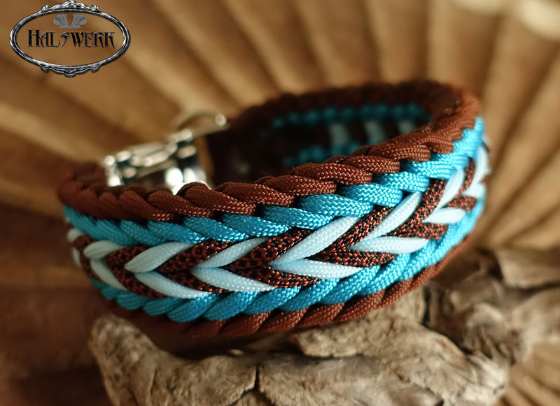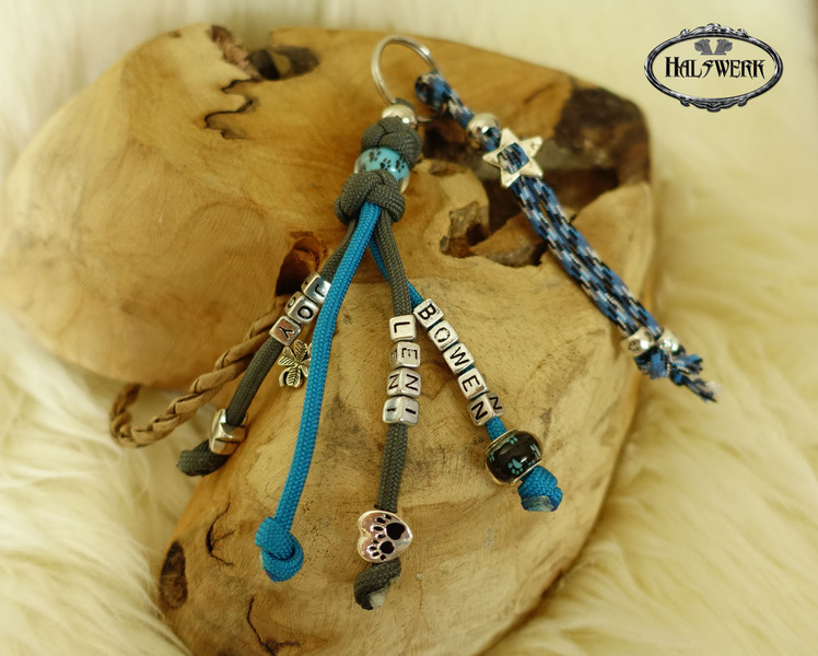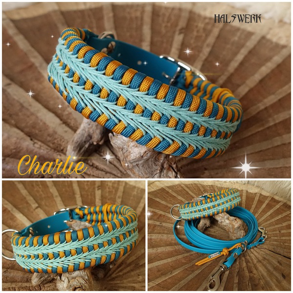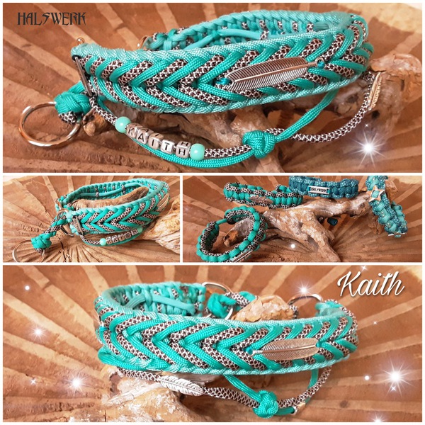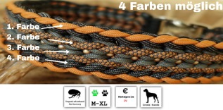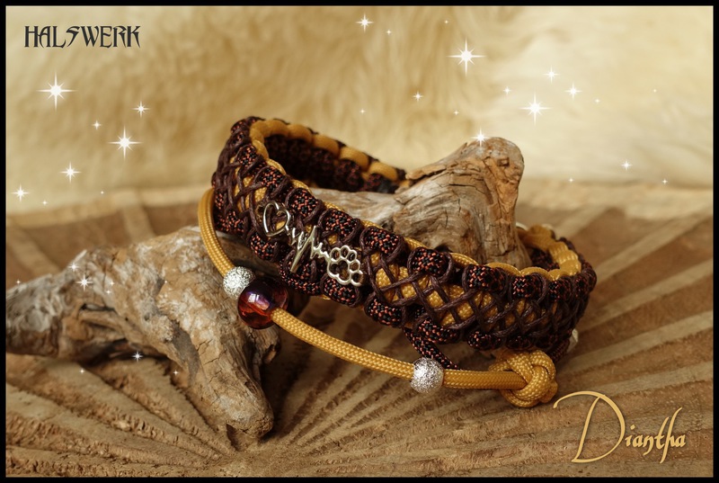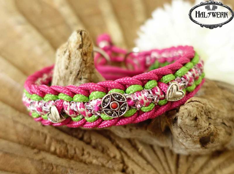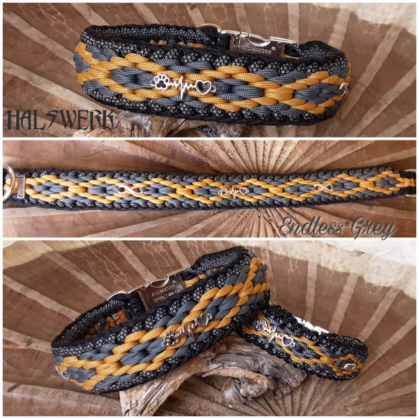 Schmuckhalsband für leinenführige Hunde. Kombination aus Fallschirmseil und Borten mit diversen Charms.