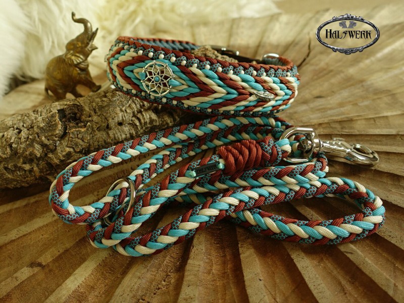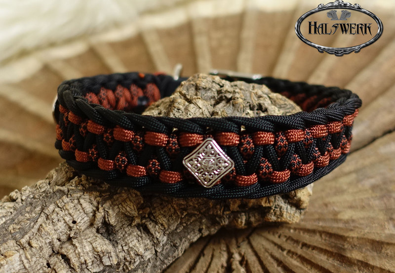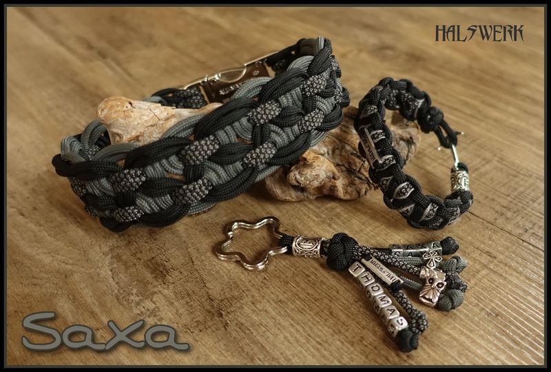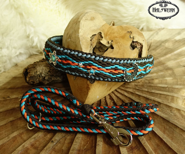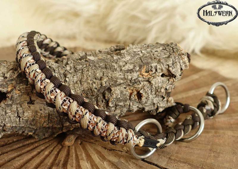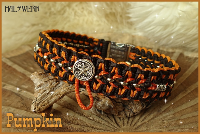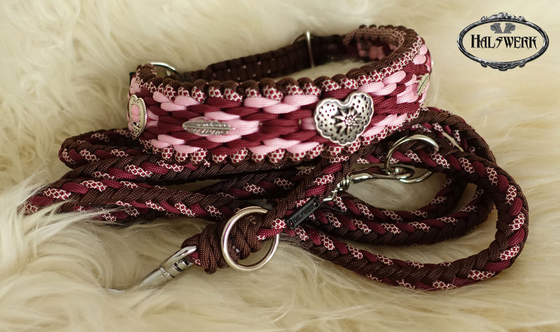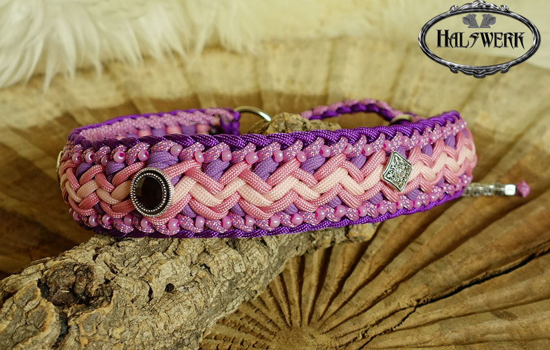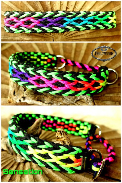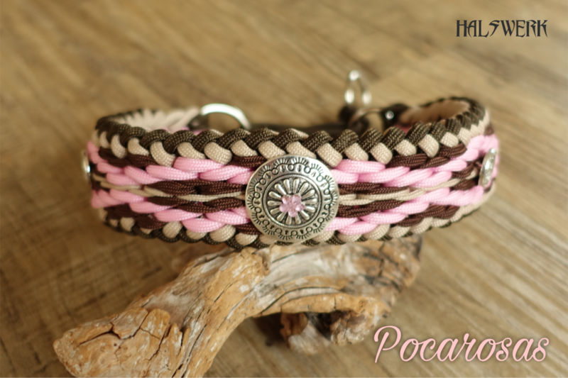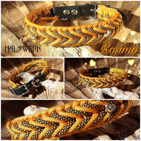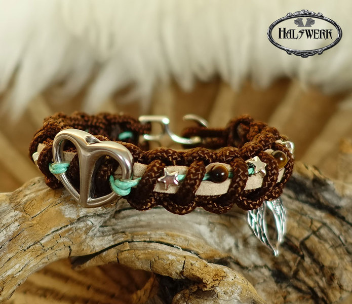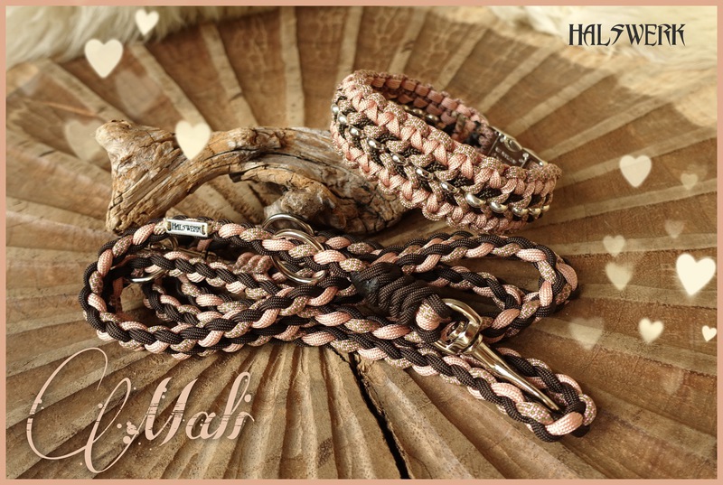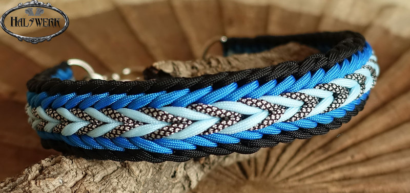 Schmuckhalsband für leinenführige Hunde. Kombination aus Fallschirmseil und Borten mit diversen Charms.