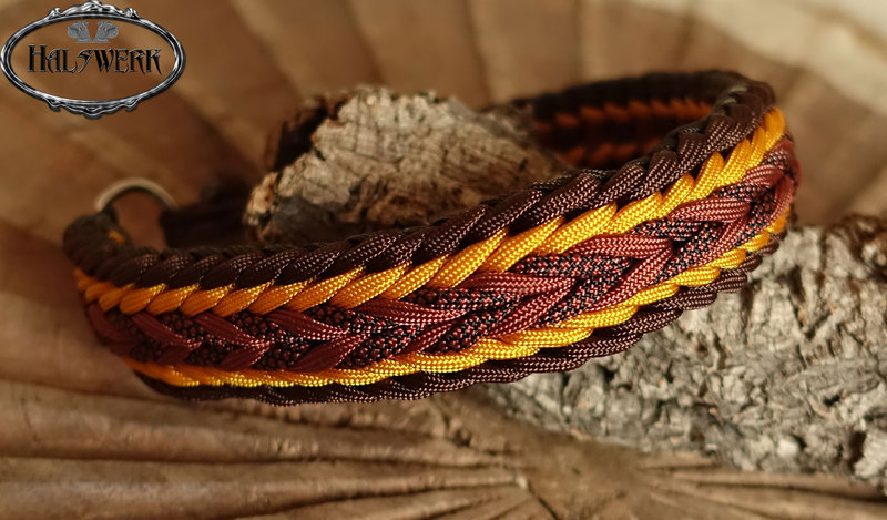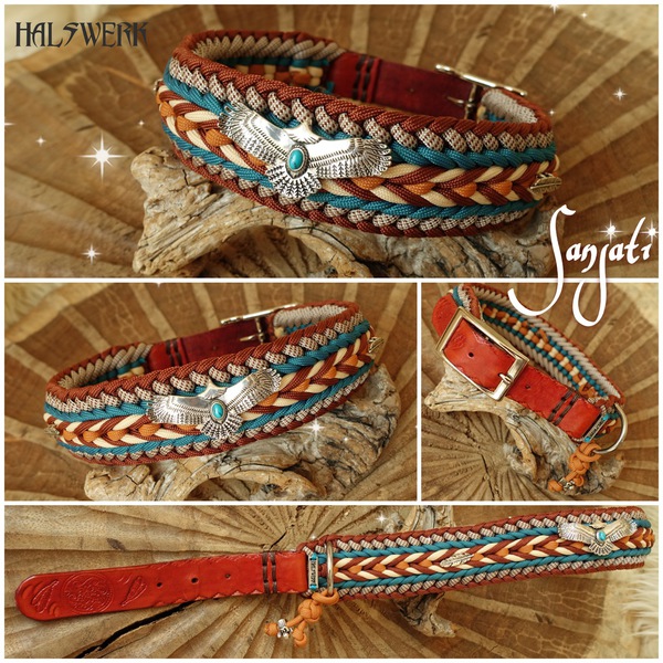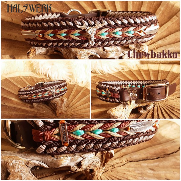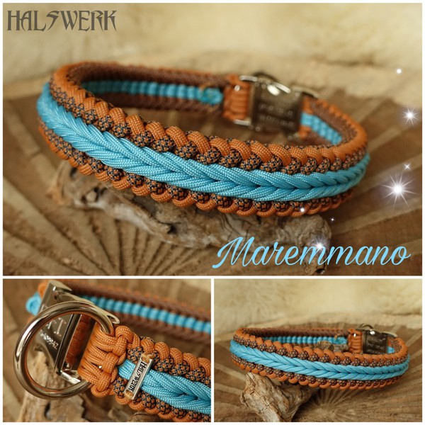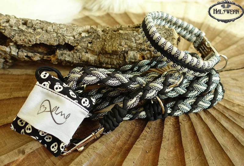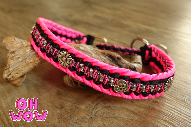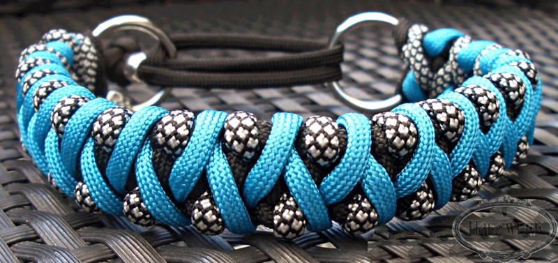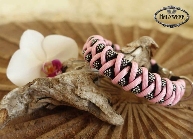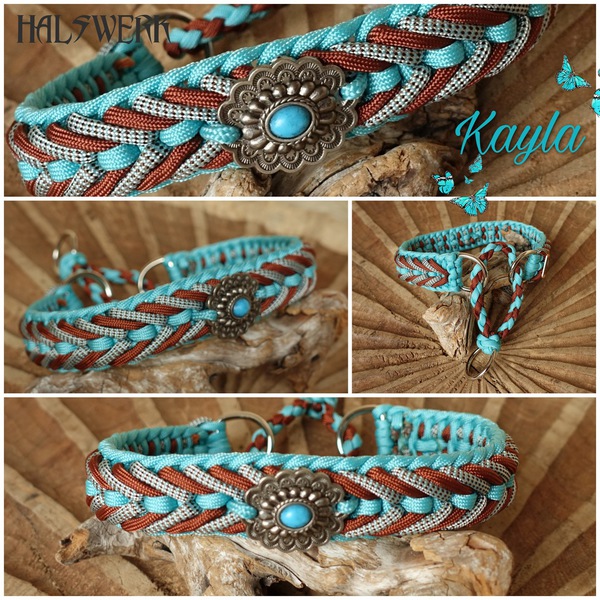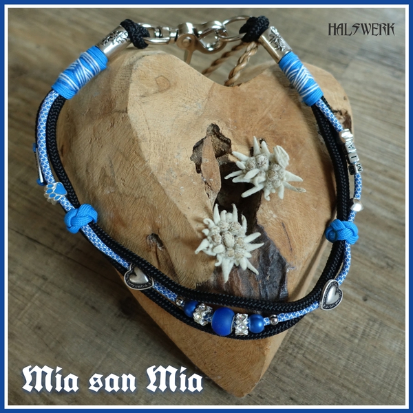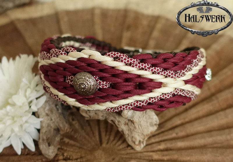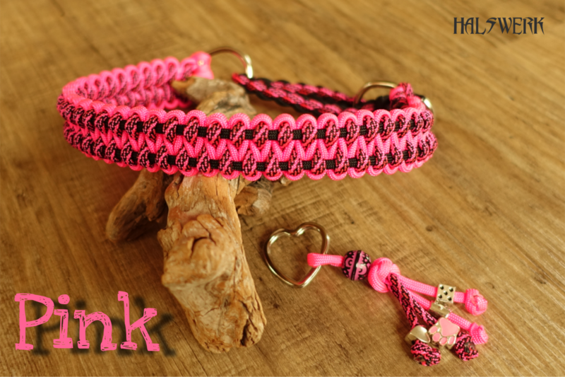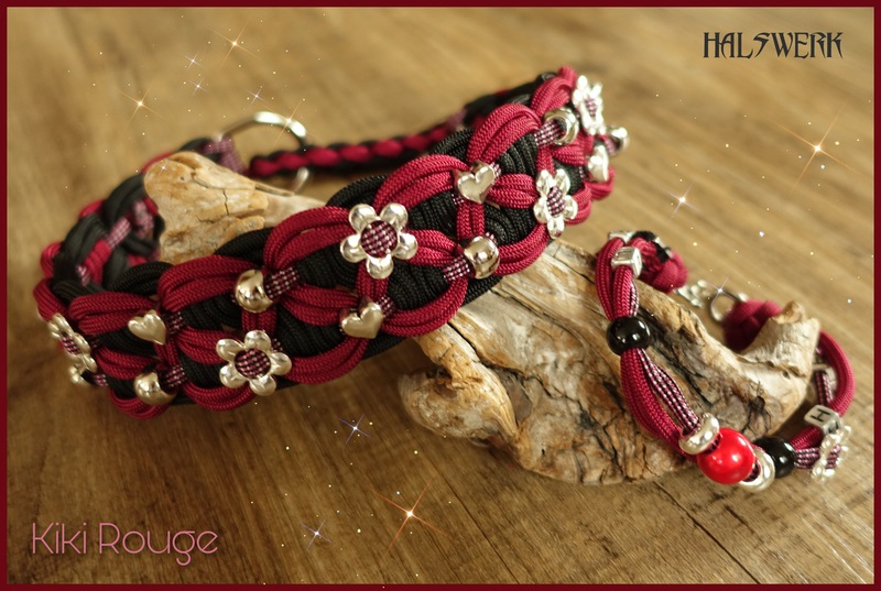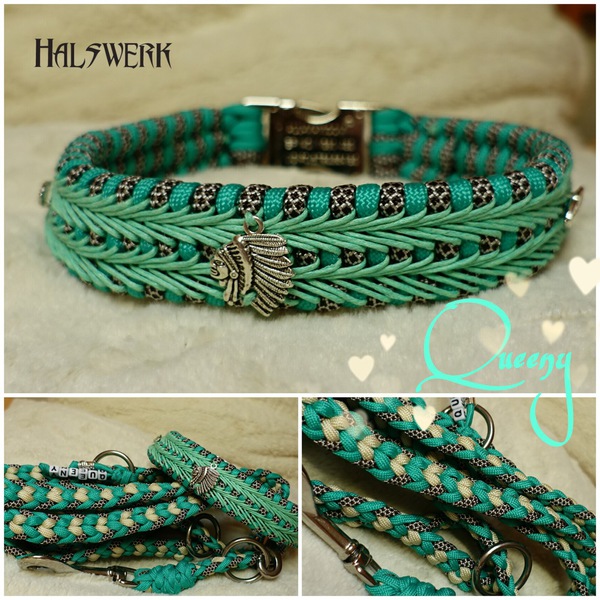 Schmuckhalsband für leinenführige Hunde. Kombination aus Fallschirmseil und Borten mit diversen Charms.
