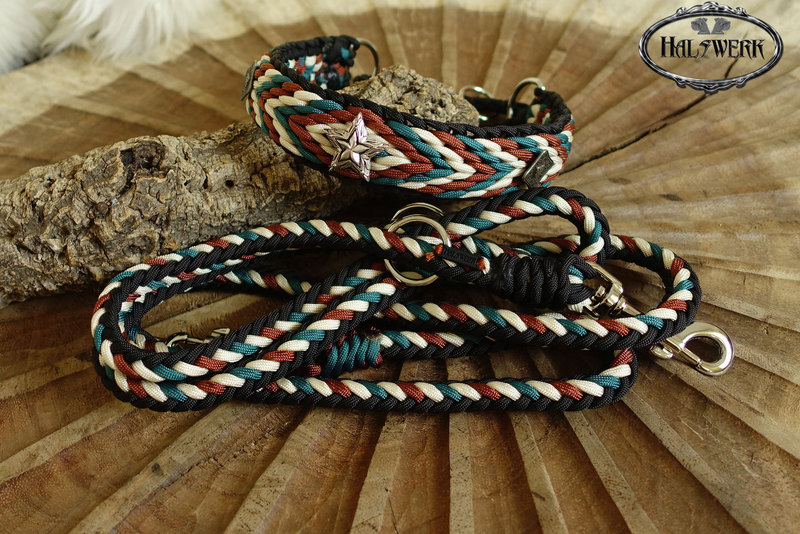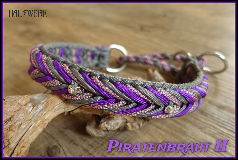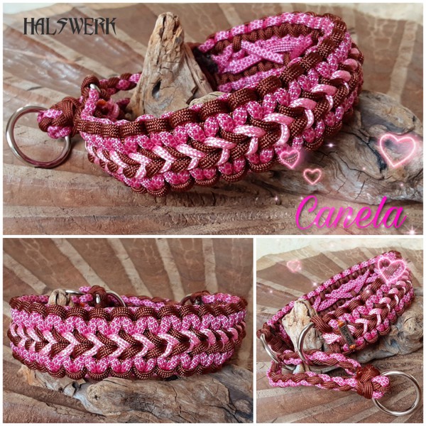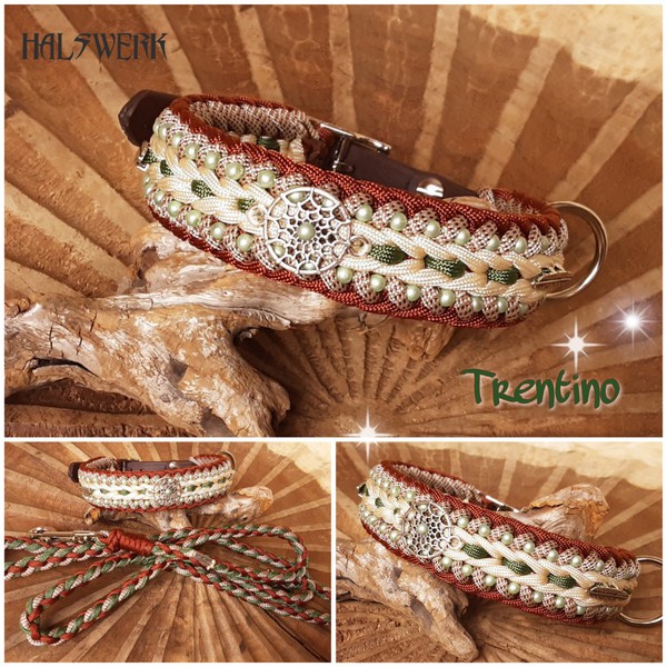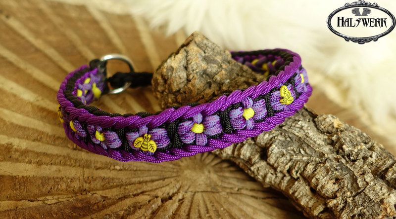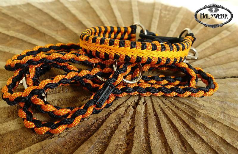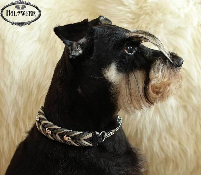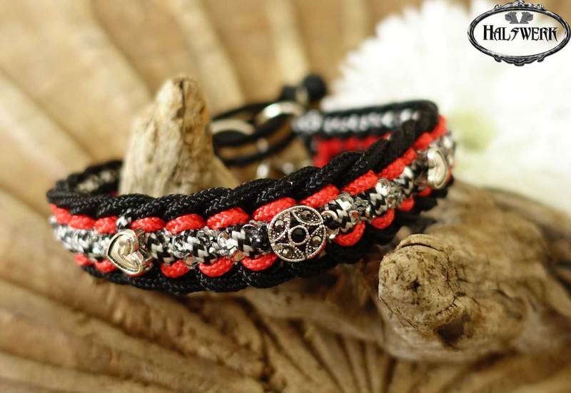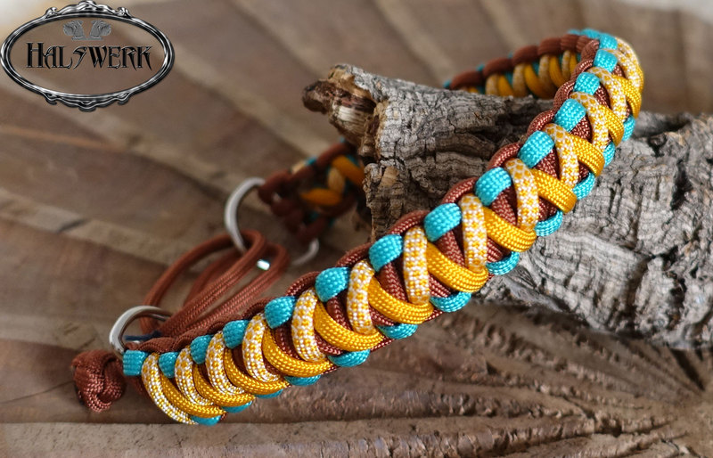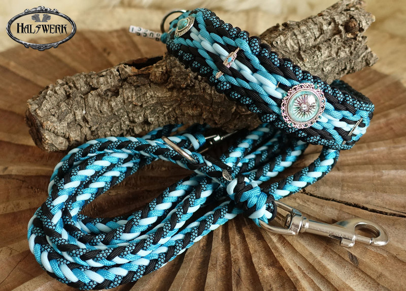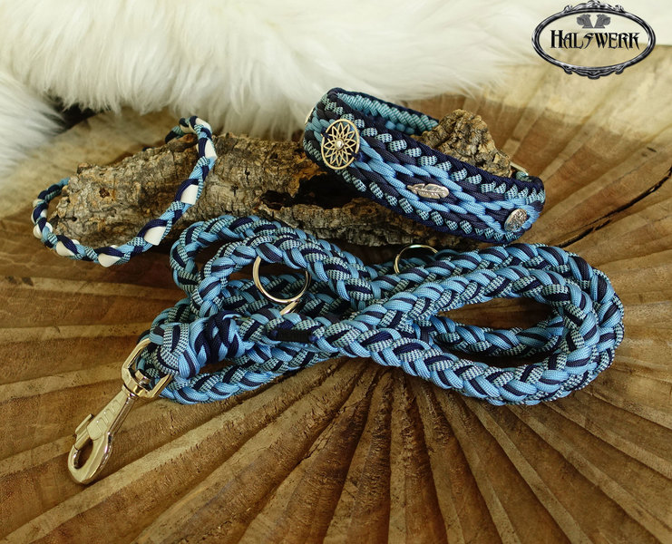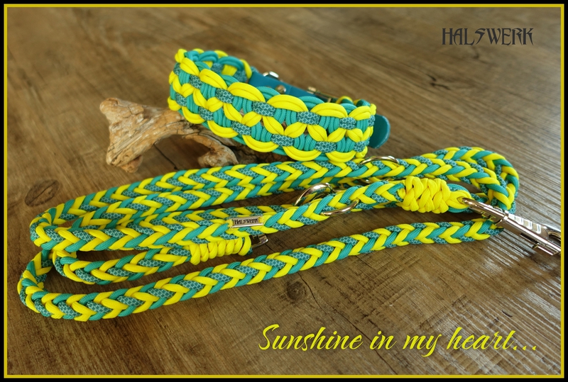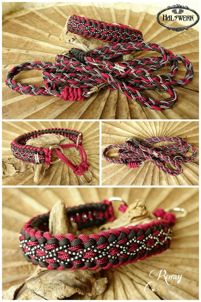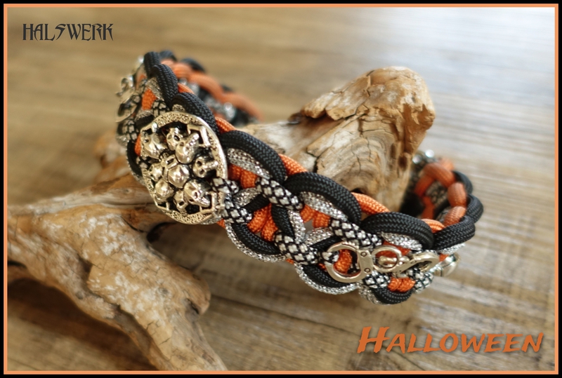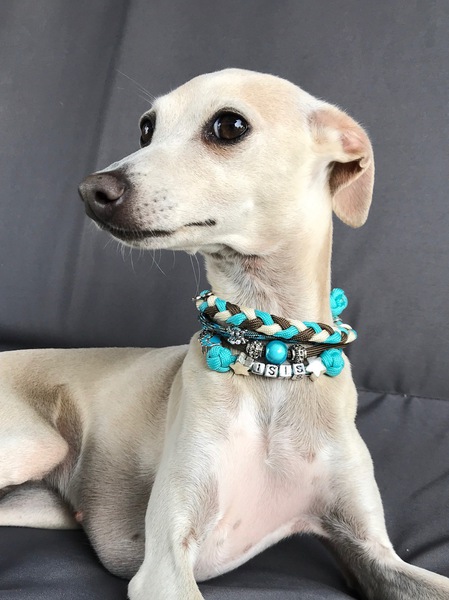 Schmuckhalsband für leinenführige Hunde. Kombination aus Fallschirmseil und Borten mit diversen Charms.