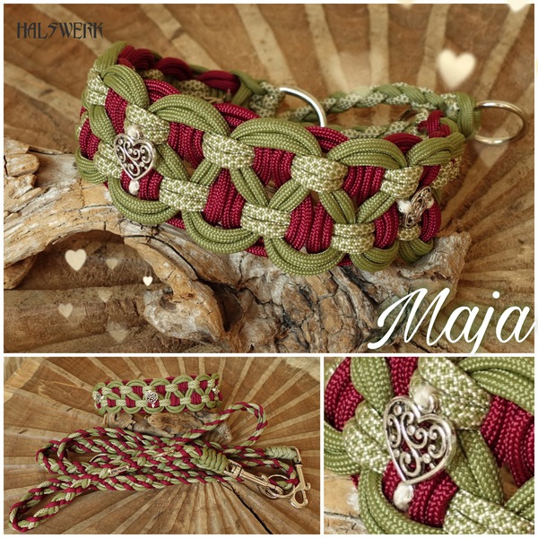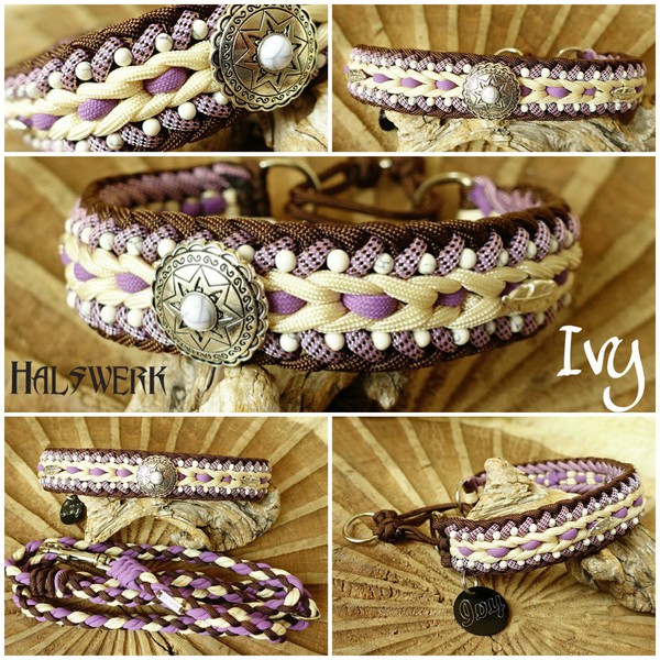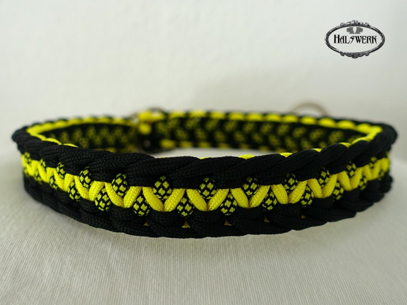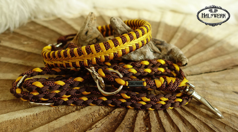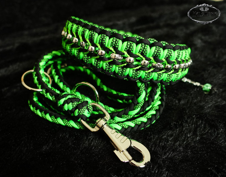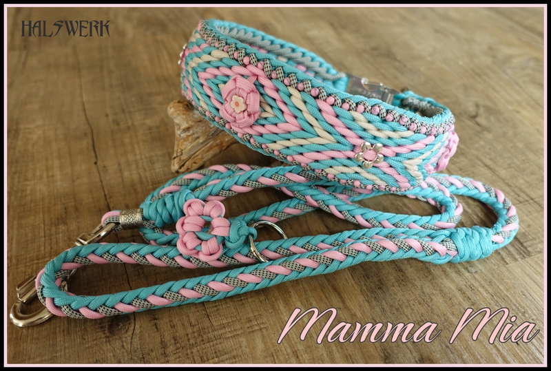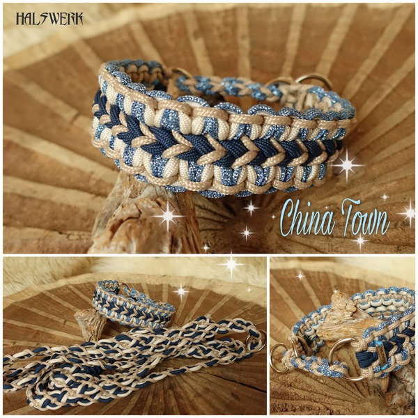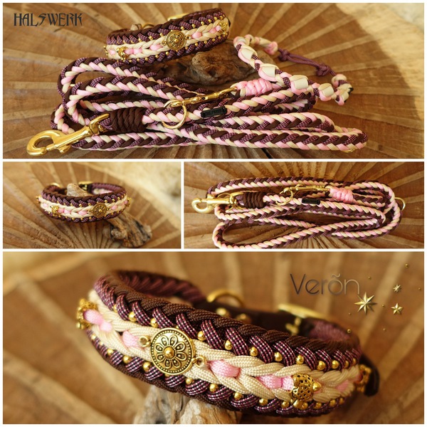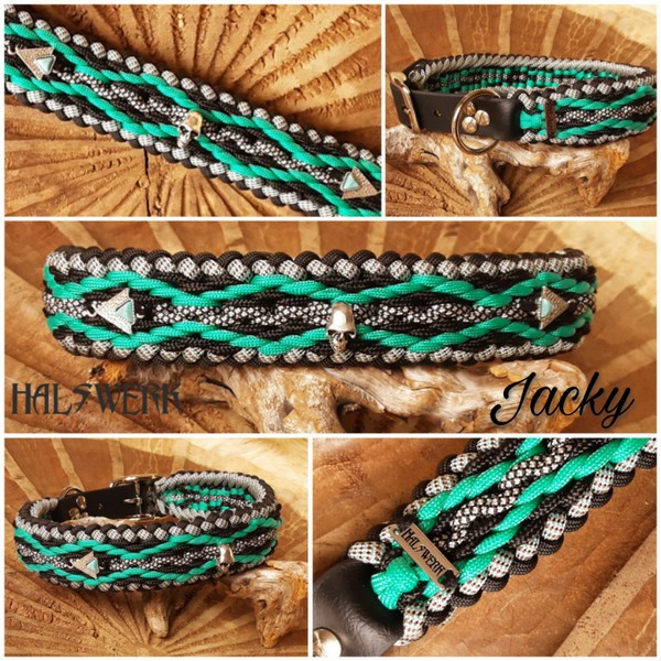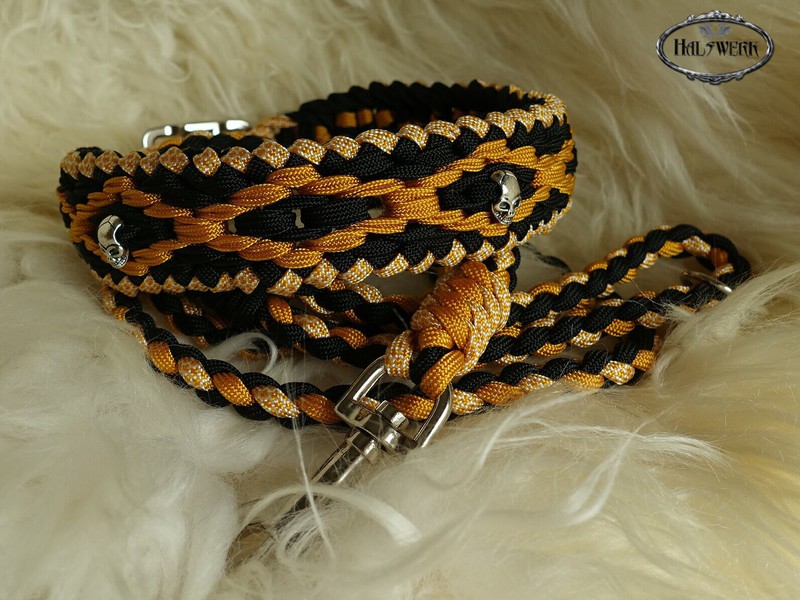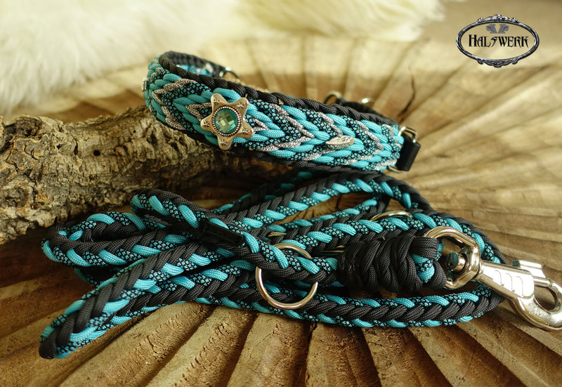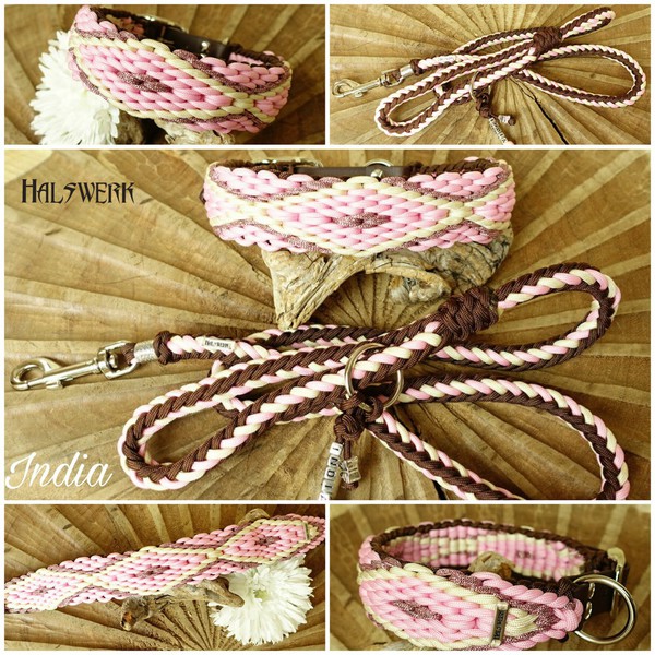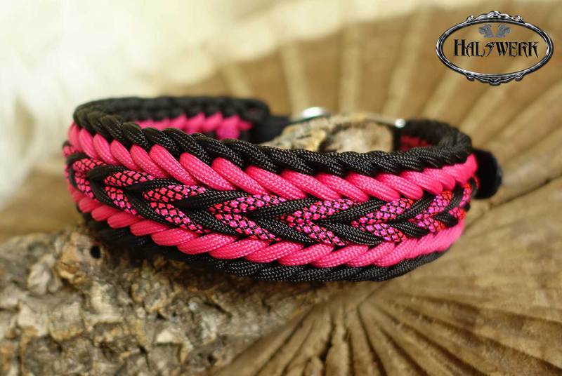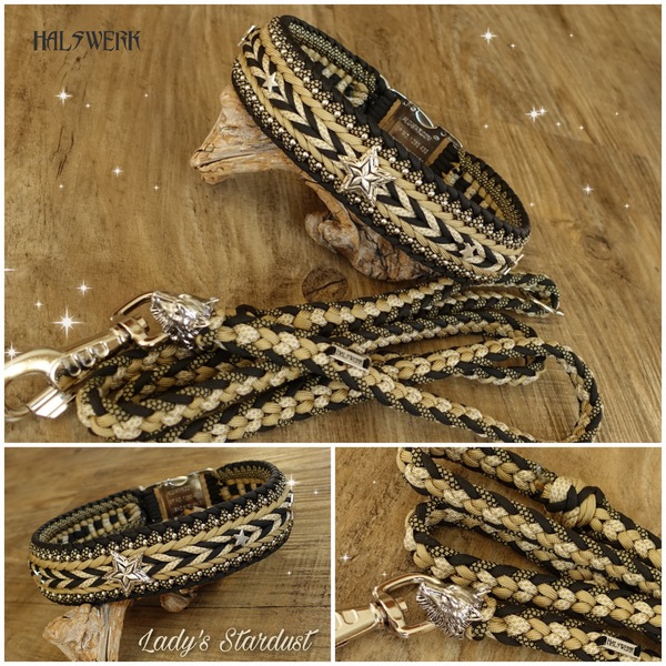 Schmuckhalsband für leinenführige Hunde. Kombination aus Fallschirmseil und Borten mit diversen Charms.